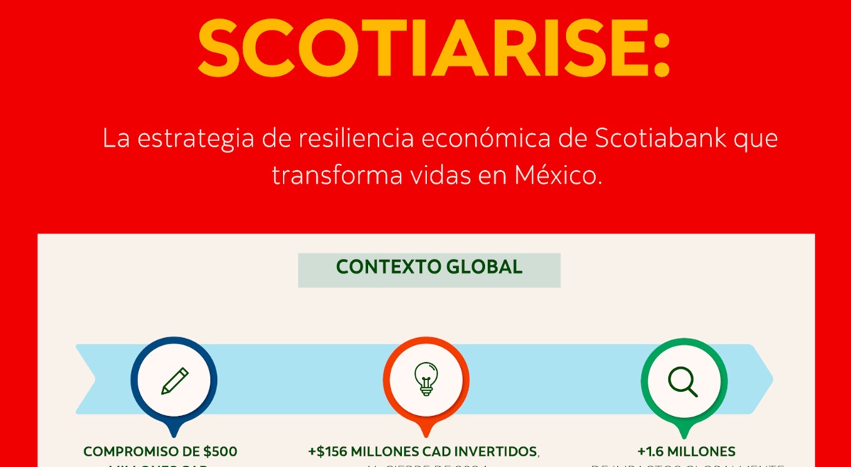 A través de su estrategia global de impacto social ScotiaRISE, Scotiabank tiene el objetivo de destinar $500 millones CAD para impulsar la resiliencia económica de las comunidades en las que opera a 2030, hasta 2024 ya ha destinado más de 156 millones CAD a nivel global.
